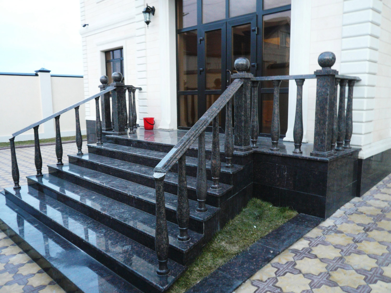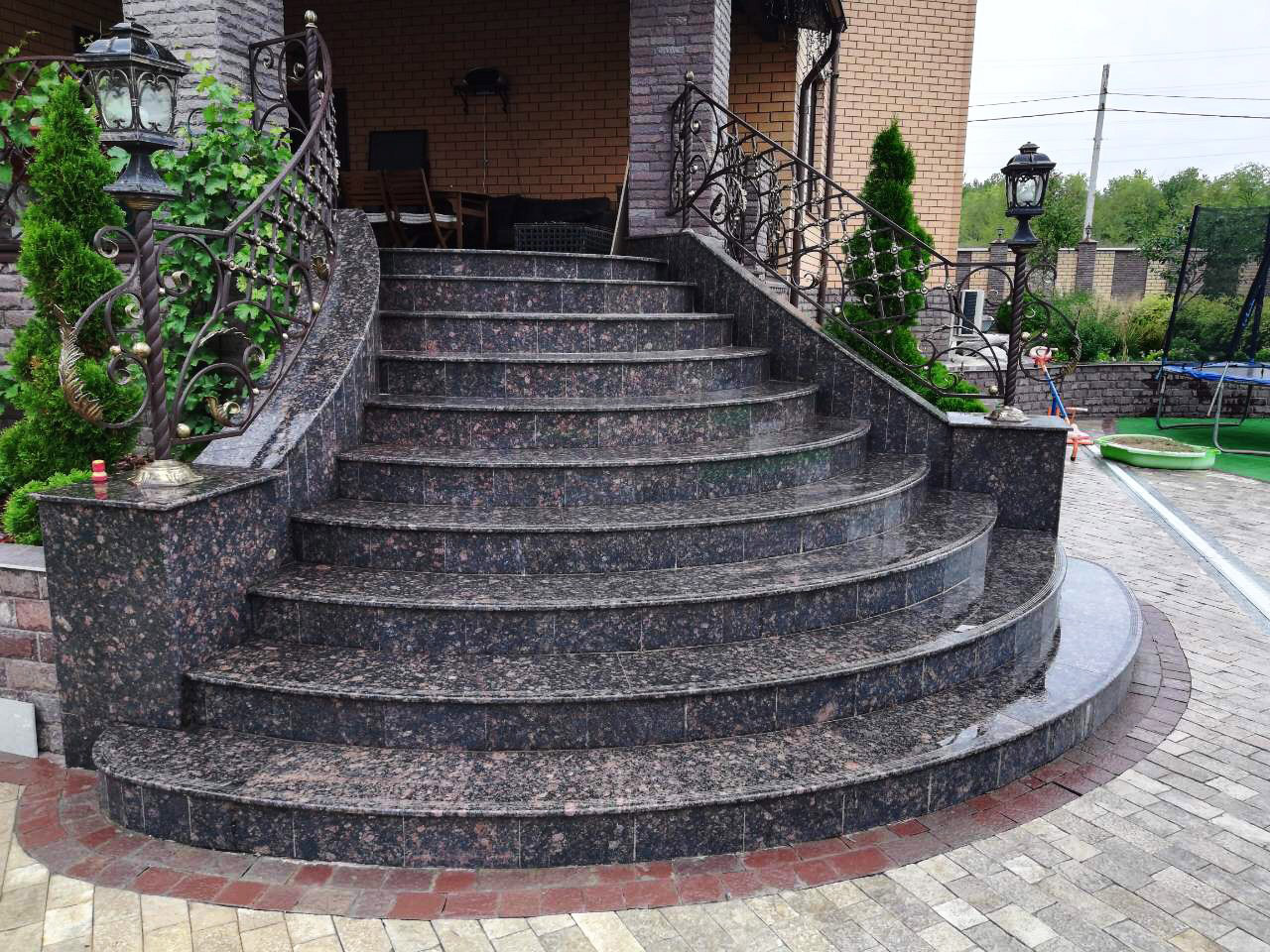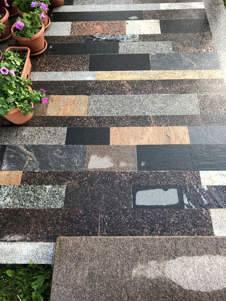 Для экстерьера — производим облицовку фасада, можем возвести колонны и другие архитектурные элементы здания, облицовку уличных лестниц и крыльца, вашу территорию замостим гранитом.